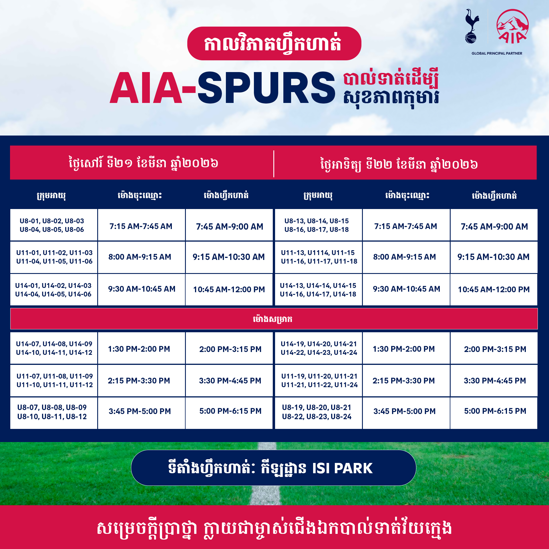 កម្មវិធី AIA-SPURS បាល់ទាត់ដើម្បីសុខភាពកុមារ នឹងធ្វើឡើងនៅទីក្រុងភ្នំពេញ ផ្តល់បទពិសោធន៍បាល់ទាត់ដ៏គួរឱ្យចងចាំដល់កុមារ តាមរយៈការបណ្តុះបណ្តាលមានស្តង់ដារអន្តរជាតិ ការបណ្តុះបណ្តាលក្នុងស្រុក និងការប្រកួតមិត្តភាព។
